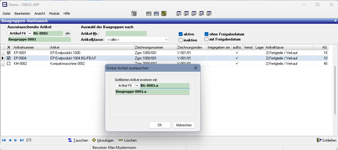 Spezielle Module wie der [Baugruppen-Austausch] gestatten die Bearbeitung der Arbeitspläne im Überblick.