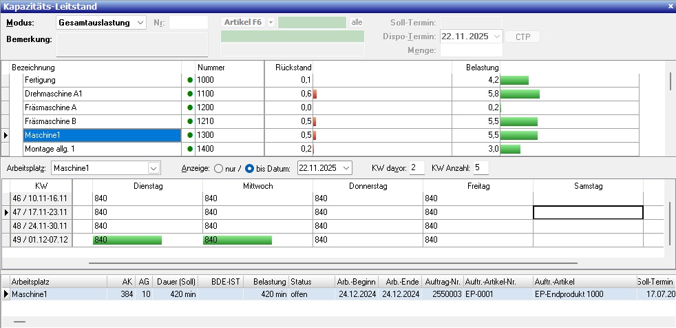 Der [Kapazitäts-Leitstand] berechnet in Echtzeit - auch bei mehreren tausend Fertigungsaufträgen - die Auslastung.