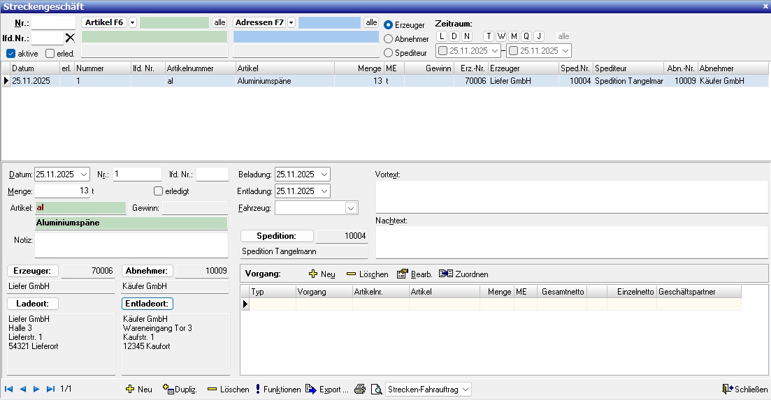 Das Modul [Streckengeschäft] verknüpft die drei Geschäfte (Einkauf, Transport, Verkauf) und berechnet den Gewinn für den kompletten Auftrag.